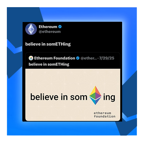 The Ethereum Foundation tweeted "believe in somETHing" on Ethereum’s 10-year anniversary and Ethereum themselves retweeted it, along with many major companies and projects in the space.